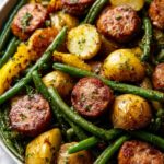 - Prepare Vegetables and Sausage: In a large bowl, toss the sliced zucchini, green beans, and bell pepper with olive oil, dried basil, dried oregano, garlic powder, salt, and black pepper until everything is well-coated. Then add the sliced sausages to the bowl and gently mix to combine flavors.