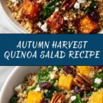 A vibrant and wholesome Autumn Harvest Quinoa Salad featuring roasted butternut squash, dried cranberries, crunchy pecans, fresh spinach, and tangy feta cheese, all tossed in a maple syrup and olive oil dressing. Perfect as a nutritious, colorful, and satisfying meal or side dish during the fall season.
