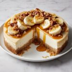 After it has cooled, refrigerate the cheesecake for at least 4 hours or, even better, overnight to allow it to set completely. Just before serving, artfully arrange the sliced ripe bananas on top, drizzle with caramel sauce, and sprinkle with the chopped walnuts or pecans for that signature crunch and nutty aroma.
