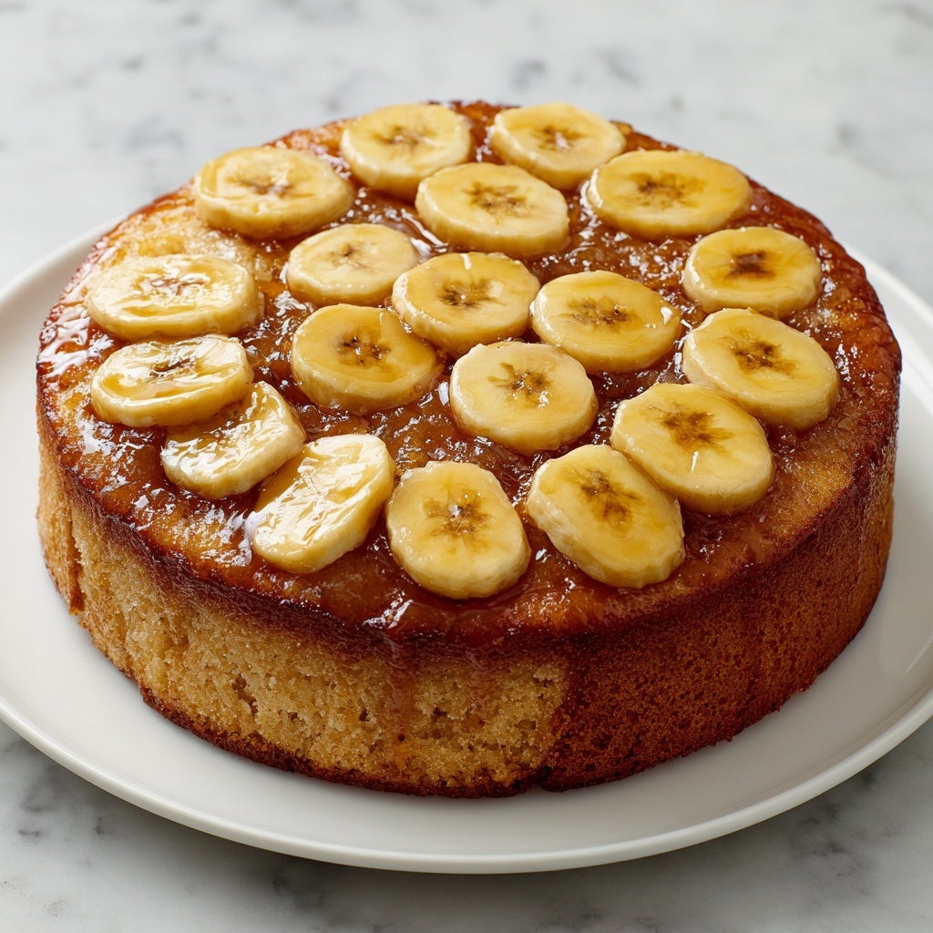 - Cool and Invert: Allow the cake to cool in the pan for about 10 minutes, then carefully invert it onto a serving plate so the banana topping is displayed on top.