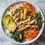 - Add Fresh Vegetables: Arrange shredded carrots, red cabbage, chopped cucumber, green onions, and cilantro on top of the chicken and rice in each bowl.