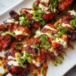 - Serve: Arrange the cooked skewers on a serving platter, drizzle or serve alongside the Bang Bang sauce, and garnish with finely sliced green onions for a fresh, colorful finish.