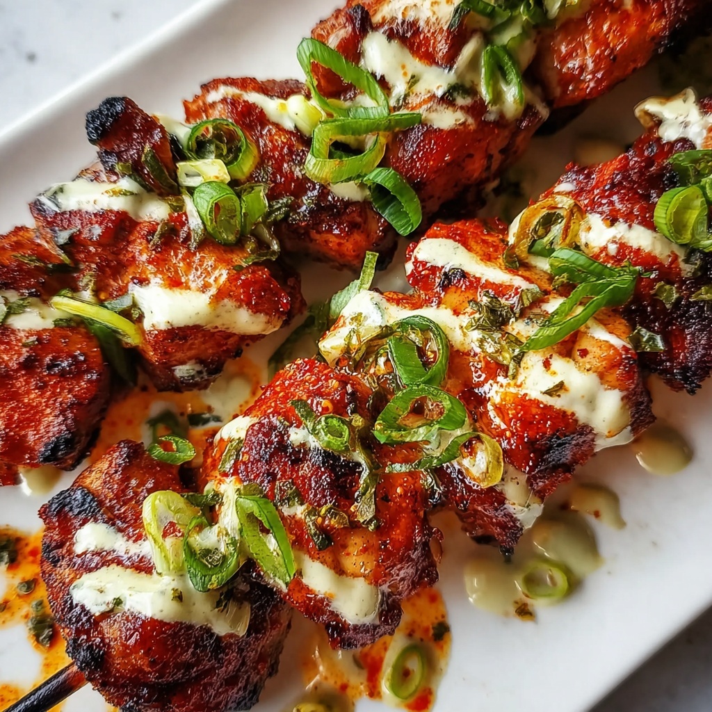 Sprinkle finely sliced green onions over the skewers before serving. They add an inviting pop of color as well as a fresh, crisp contrast to the creamy sauce and crispy chicken. For an extra touch, a scatter of toasted sesame seeds can give a nutty crunch and more visual appeal.
