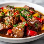 This Best Ever Pepper Steak Recipe features tender beef stew meat simmered with colorful bell peppers, garlic, and a savory blend of stewed tomatoes, beef broth, and Worcestershire sauce. Prepared with a simple sear and slow-cooked to perfection in a Crockpot, this dish delivers rich flavors and melt-in-your-mouth tenderness, making it an ideal comforting meal for any occasion.