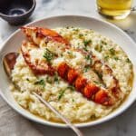 A luxurious Butter Poached Lobster Risotto featuring tender lobster meat gently poached in butter and folded into a creamy, flavorful risotto made with arborio rice, shallots, garlic, white wine, and seafood stock. Finished with Parmesan cheese, lemon zest, and fresh chives for a rich and elegant main course.