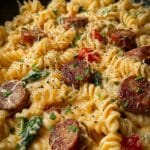 A creamy, comforting Cheddar Ranch Pasta featuring tender rotini cooked in a flavorful blend of chicken broth, milk, ranch seasoning, and garlic, combined with savory smoked sausage, roasted red peppers, and fresh baby spinach for a hearty, family-friendly meal ready in just 35 minutes.