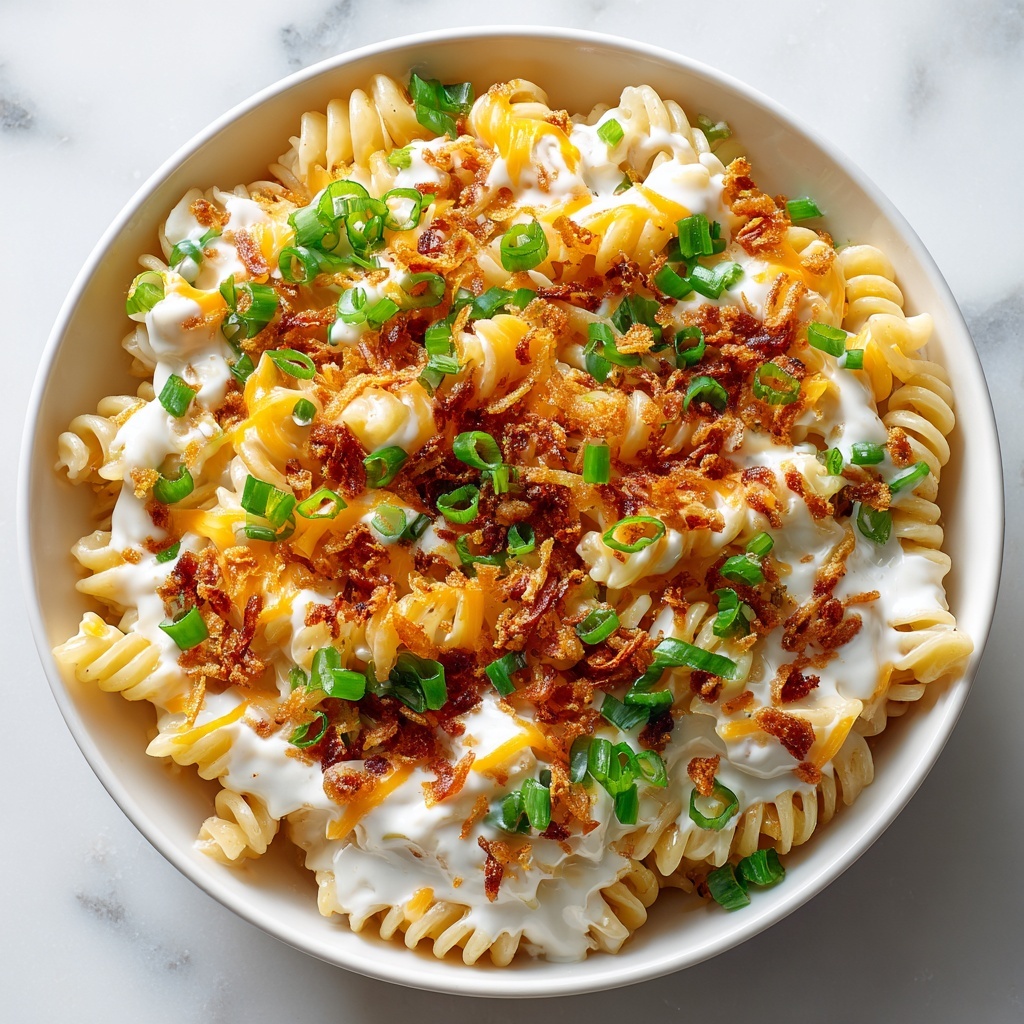 This Cheesy Jalapeño Popper Pasta Salad is a creamy, spicy, and flavorful dish perfect for parties or potlucks. Made with tender rotini pasta tossed in a rich blend of cream cheese, sour cream, and mayonnaise, it is loaded with shredded cheddar, diced jalapeños, and green onions. Crispy fried onions on top add a delightful crunch to balance the creamy texture. Chill before serving for the best taste and texture.