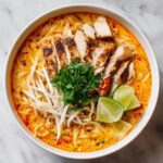 Chicken Khao Soi is a rich and flavorful Northern Thai dish featuring tender chicken thighs simmered in a fragrant curry broth made with coconut milk, red curry paste, and turmeric. Served over egg noodles and garnished with fresh herbs, crispy shallots, and lime, this comforting soup perfectly balances creamy, spicy, and tangy elements for an authentic and satisfying meal.
