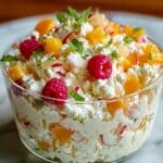 Want to impress your guests? Serve Chris’s Hawaiian Fluff Salad Recipe in clear dessert bowls or individual mason jars layered with fresh fruit slices on the bottom. Another fun idea is to hollow out a pineapple half and use it as a natural bowl—it’s both eye-catching and adds more pineapple aroma to the experience!