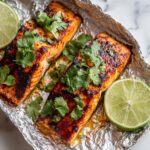 Generously rub the salmon fillet on both sides with the spice mixture, making sure every inch gets a bit of that smoky, spicy goodness. Place the salmon on top of the lime slices you arranged earlier. Pour the honey-lime marinade over the fish, letting it soak in. Carefully fold the foil edges around the salmon, making a sealed tent to keep the moisture and flavors locked in during baking.