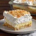 Coconut Cream Lush is a rich, creamy, no-bake layered dessert featuring a graham cracker crust, a luscious cream cheese and whipped topping layer, topped with coconut and vanilla pudding layers, all garnished with toasted shredded coconut. Perfect for coconut lovers looking for an easy and decadent treat.