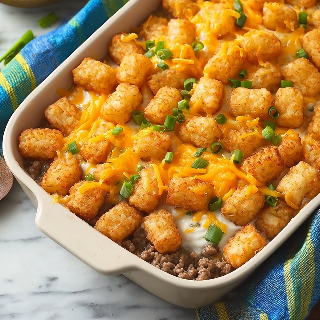 - Bake: Place the casserole dish in the preheated oven and bake for 30-35 minutes until the tater tots are golden brown and crispy.