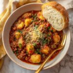 This Cozy Gnocchi Bolognese Recipe features a rich, slow-simmered meat sauce made with ground beef and pork, aromatic vegetables, pancetta, and a savory blend of herbs and spices. The sauce is finished with parmesan cheese and cream for extra depth and creaminess, then tossed with tender potato gnocchi for a comforting and flavorful Italian-inspired meal perfect for a hearty family dinner or special occasion.