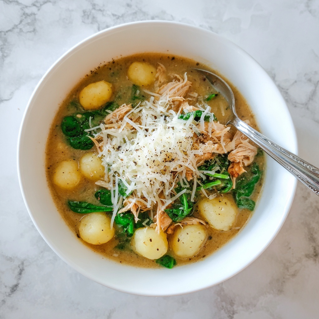 A warm and creamy one-pot meal combining tender shredded chicken, pillowy gnocchi, fresh spinach, and Parmesan cheese in a savory broth. Perfect for a comforting dinner that comes together in just 30 minutes.
