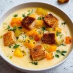 This Creamy Vegetable Soup with Croutons is a comforting and nutritious dish perfect for any season. Made from a blend of fresh vegetables and aromatic herbs, it’s pureed to a smooth, creamy texture and enriched with milk or cream. The soup is complemented by crunchy homemade herb-seasoned croutons baked to golden perfection. Ideal for a light lunch or a cozy dinner, this recipe is easy to prepare and packed with wholesome flavors.
