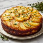 This Crispy Balsamic Thyme Potato Torte is a delightful, elegant dish featuring thinly sliced potatoes layered in a spiral pattern, marinated in a flavorful balsamic, olive oil, garlic, and thyme glaze, then baked to a golden, crispy perfection. Topped with optional Parmesan cheese, this torte balances tangy balsamic with fresh herbs making it a perfect side or vegetarian centerpiece.