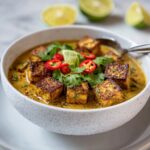 This Crispy Lemongrass Tofu in Creamy Coconut Curry Bliss features firm tofu coated in aromatic spices and fried to crispy perfection, then immersed in a luscious coconut curry infused with lemongrass, ginger, and subtle heat. A flavorful plant-based dish combining textures and vibrant Southeast Asian flavors, perfect for a satisfying vegan meal.