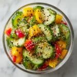 This salad is not suitable for freezing. The fresh cucumbers and crisp bell peppers lose their texture and become watery when thawed, so it’s best to prepare and enjoy it fresh or within a couple of days.