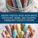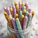 Celebrate Easter with these festive and colorful Easter Pretzel Rods! Crisp pretzel rods are dipped in rich white chocolate, sprinkled with pastel M&M pieces, and finished with a decorative drizzle of candy melts. Perfect for springtime parties, Easter baskets, or a sweet snack that’s easy to make and delightfully crunchy and chocolaty.