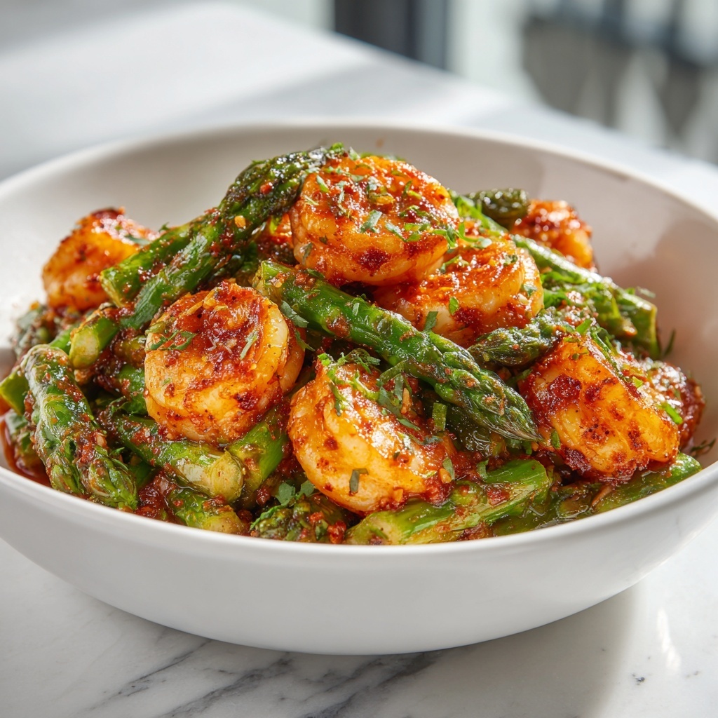 A quick and nutritious shrimp and asparagus stir fry that comes together in just 20 minutes. This healthy dish features tender shrimp and crisp asparagus cooked with garlic, soy sauce, and sesame oil for a flavorful, low-calorie meal perfect for busy weeknights.