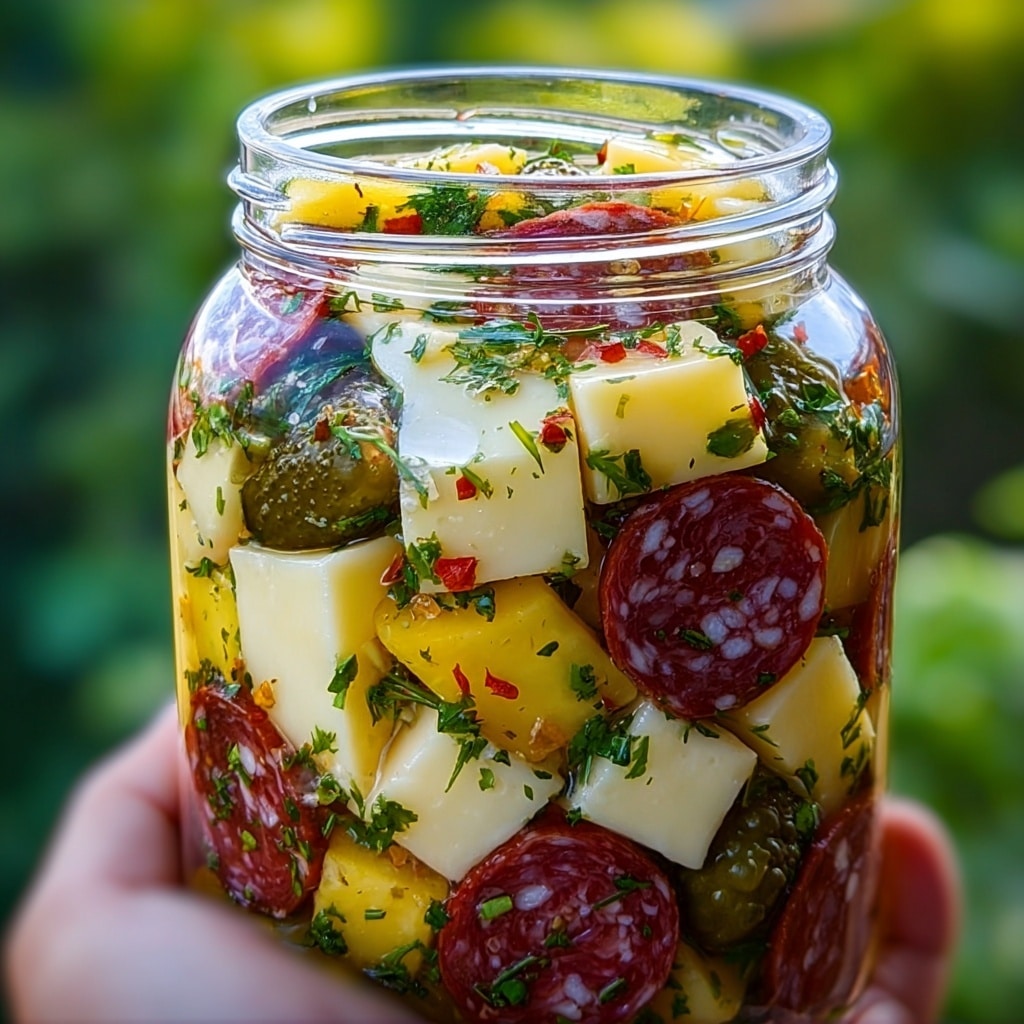 For parties, serve this Easy Marinated Cheese Appetizer with Salami & Pickles Recipe in small glass jars or on a vibrant wooden charcuterie board alongside cured meats and fresh fruit. Layering with fresh herbs and colorful pickles creates an inviting display that will delight your guests before the first bite.