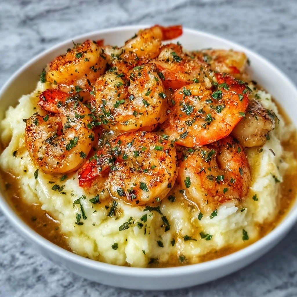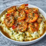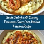 A comforting and flavorful Garlic Shrimp with creamy mashed potatoes dish that combines tender shrimp sautéed with garlic and spices, smothered in a rich Parmesan cream sauce, served over smooth buttery mashed potatoes. Perfect for a satisfying weeknight dinner or a special occasion meal.