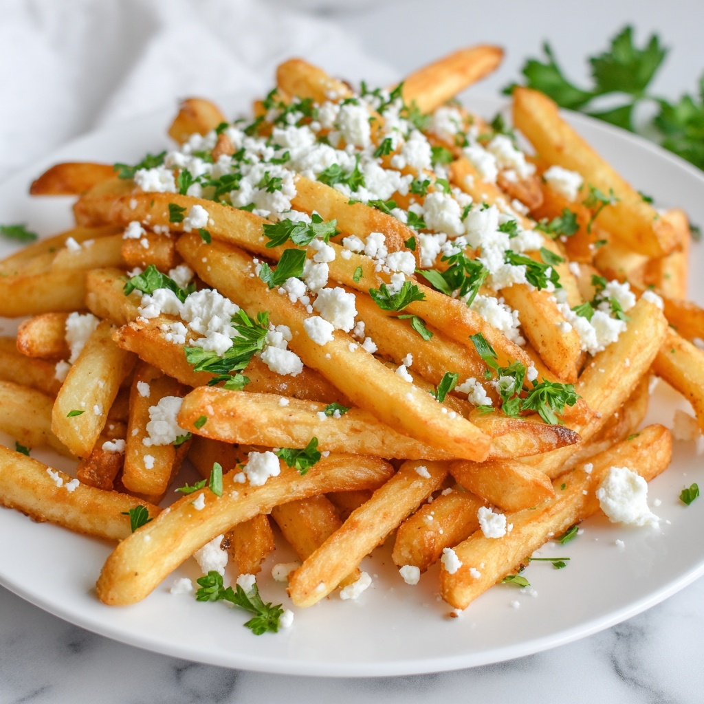 Crispy Greek Feta Fries combine golden baked russet potatoes with tangy crumbled feta and fragrant herbs for a deliciously elevated fry experience. This easy recipe uses simple ingredients and oven baking to achieve perfect crispiness, topped with fresh parsley for a burst of color and flavor.