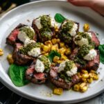 Now comes the fun part—building a stunning plate. Lay the sliced steak on a platter and generously spoon the arugula pesto over the top. Scatter the torn burrata cheese around to deliver creamy pockets of richness throughout the dish. Serve alongside the grilled corn, seasoning everything with a final sprinkle of salt and pepper to taste. The combination of textures and flavors in this presentation is simply irresistible.