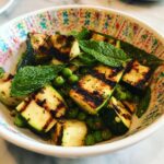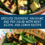 A refreshing and vibrant grilled zucchini, halloumi, and pea salad dressed with a tangy mint, Dijon mustard, and lemon dressing, perfect for a light lunch or summer side dish.