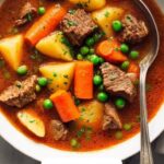 This hearty beef stew recipe features tender, slow-simmered beef cubes cooked with a medley of vegetables, herbs, and a rich broth infused with tomato paste and optional red wine. Perfect for a comforting meal, this stew is simmered until the meat is melt-in-your-mouth tender and the flavors are deeply developed, then finished with fresh peas and parsley for a burst of freshness.