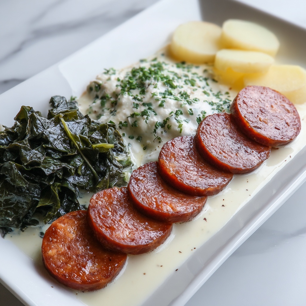 Serve generous scoops of the stamppot onto plates, topping each with thick slices of the smoked sausage. A light drizzle of olive oil at the end adds a subtle richness and a glossy finish. Now you’re ready to dive into a dish that is as satisfying to look at as it is to devour.