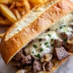 This hearty and flavorful steak sandwich features thinly sliced ribeye steak cooked to perfection, caramelized onions, melted Havarti cheese, and a fragrant herb garlic butter spread on a crusty baguette. Ready in just 30 minutes, it combines savory richness with tender textures for a satisfying meal perfect for lunch or dinner.