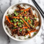 - Assemble the Bowl: Divide the cooked rice into four bowls. Top each serving with the sautéed Korean beef. Garnish generously with sliced green onions and a sprinkle of sesame seeds to add texture and a fresh, nutty flavor.