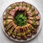 This Lamb with Mint and Pistachio Gremolata recipe combines tender, flavorful lamb racks charred on the grill and finished in the oven, served with a fresh, zesty gremolata made from mint, pistachios, and lemon. The pomegranate seeds add a delightful burst of sweetness, creating a sophisticated, aromatic dish perfect for special occasions or an impressive weekend meal.