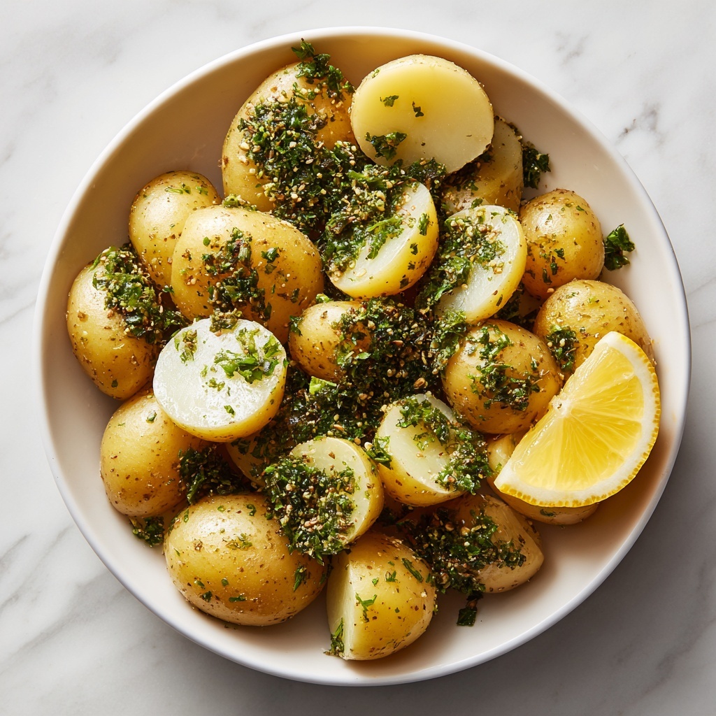 A fresh and zesty Lemon Potato Salad featuring tender baby potatoes tossed in a vibrant lemon and Dijon mustard dressing, garnished with green onions and parsley, perfect for a light and flavorful side dish.