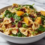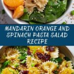 A refreshing Mandarin Orange and Spinach Pasta Salad featuring a tangy teriyaki dressing, tender bow tie pasta, sweet mandarin oranges, dried cranberries, and fresh spinach. Perfectly chilled and tossed with crunchy green onions and toasted sesame seeds, this vibrant salad combines sweet, savory, and tangy flavors ideal for light lunches or potluck gatherings.