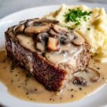 - Serve: Slice the meatloaf and spoon the mushroom gravy generously over each serving.