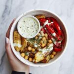 Now comes the fun part: plating! Spread a generous layer of the tzatziki sauce on the bottom of each bowl or plate, creating a creamy bed for your roasted vegetable medley. Heaping the warm roasted chickpeas, potatoes, peppers, and onions on top gives you a beautiful contrast between the cool sauce and the spicy, savory vegetables. This dish is ready to be enjoyed immediately, inviting you to savor the bold Mediterranean flavors in every bite.