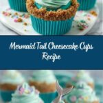 Delight in these whimsical Mermaid Tail Cheesecake Cups, featuring a creamy teal cheesecake filling atop a crunchy vanilla wafer crust, adorned with charming edible sugar mermaid tail toppers. Perfect for parties or a fun dessert to impress guests, these no-bake cheesecake cups combine smooth textures and delightful flavors in a visually captivating presentation.
