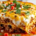 This Mexican Lasagna recipe is a delicious fusion dish combining traditional lasagna layering with bold Mexican flavors. Featuring seasoned ground beef, a creamy ricotta cheese mixture, and a blend of Mexican cheeses layered between soft flour tortillas, it’s a comforting and satisfying meal perfect for family dinners. Baked to bubbly perfection and garnished with fresh cilantro, this dish pairs wonderfully with sour cream and salsa.