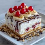 This No-Bake Banana Split Cake is a delightful layered dessert featuring a buttery graham cracker crust, creamy sweetened cream cheese, fresh bananas, crushed pineapple, cherry pie filling, and whipped topping. Topped with nuts, chocolate syrup, and maraschino cherries, it’s a refreshing, easy-to-make treat that requires no baking and is perfect for warm days or when you want a quick yet impressive dessert.