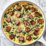 This One Pan Chicken Sausage and Orzo recipe is a quick and flavorful meal perfect for busy weeknights. Tender chicken sausage is sautéed with aromatics, then combined with toasted orzo and simmered in a creamy chicken broth mixture. Finished with fresh spinach, parmesan, and optional crushed red pepper and basil garnish, this dish delivers comforting, rich flavors all cooked in a single skillet for easy cleanup.
