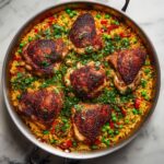 One-pan Spanish chicken and rice is a flavorful, easy-to-make dish combining tender chicken thighs with aromatic saffron rice, smoked paprika, and a medley of vegetables all cooked together in a single skillet. This hearty meal brings vibrant colors and classic Spanish flavors to your table in just 45 minutes.