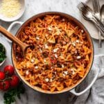 This one skillet lasagna is a quick and easy one-pan dinner that combines all the flavors of classic lasagna without the fuss of layering noodles and multiple dishes. Cooked entirely in a skillet with browned ground beef, tomato sauce, and bowtie pasta, it’s a comforting and gooey meal topped with melted mozzarella, creamy cottage cheese, and parmesan. Perfect for busy weeknights, it takes just 30 minutes to make and serves six hearty portions.