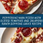 Once out of the oven, transfer your Pepperoni Naan Pizza with Sliced Tomatoes and Jalapeño Ranch Dipping Sauce Recipe to a plate. Add fresh sliced tomatoes on the side for a refreshing balance, and don’t forget the jalapeño ranch dressing for dipping—this combo brings the whole dish to life!