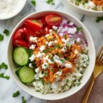 Now it’s time to add texture and freshness. Sprinkle shredded cheddar over the hot buffalo chicken so it begins to melt slightly. Add halved cherry tomatoes and diced cucumbers for juicy crunch, along with finely chopped red onion for a little zing. Crumble blue cheese or feta generously across the bowls for rich, tangy pockets of flavor that complement the spice perfectly.
