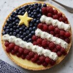 This Red, White, and Blueberry Flag Pizza is a delightful and visually stunning dessert perfect for patriotic celebrations. Featuring a sugar cookie crust, creamy sweetened cream cheese, and a vibrant topping of fresh raspberries and blueberries arranged like an American flag, this no-bake topping pizza is easy to prepare, colorful, and a crowd-pleaser for any occasion.