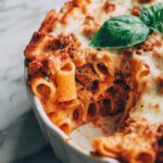 Fresh basil leaves are the perfect finishing touch to this baked pasta dish, adding a pop of color and a fragrant herbal lift. If you want a bit of extra richness, a light drizzle of good-quality extra virgin olive oil or a sprinkle of crushed red pepper flakes can also enhance each serving.