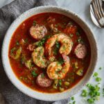 This Savory Shrimp and Sausage Gumbo is a hearty and flavorful dish perfect for cozy dinner nights. Featuring a rich homemade roux, tender andouille sausage, succulent shrimp, and a medley of vegetables simmered in a spiced broth with hints of Cajun seasoning and fire-roasted tomatoes, this gumbo delivers deep Southern comfort in every bowl. Garnished with fresh green onions, it’s a satisfying meal that brings warmth and robust flavors to your table.