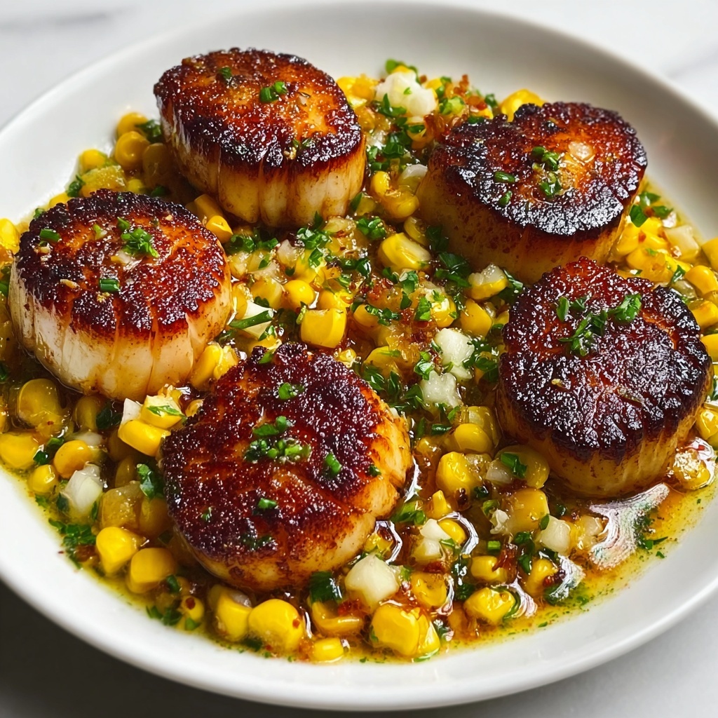 A quick and flavorful dish featuring tender seared scallops paired with a sweet corn chimichurri sauce. This recipe combines fresh parsley, garlic, and red wine vinegar to create a vibrant topping that enhances the natural sweetness of the scallops and corn, perfect for an elegant yet easy-to-make meal.